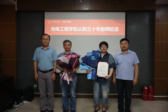在热烈的掌声中,独国社和邵晓鹏为刘巨林、杨志勇老师颁发荣休证书,为马琳、李良超老师颁发从教三十年证书,老教师为新入职教师佩戴校徽,全体人员一同合影留念。