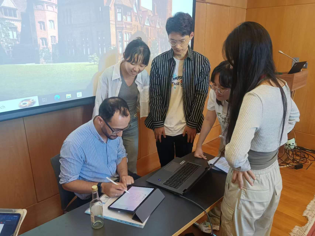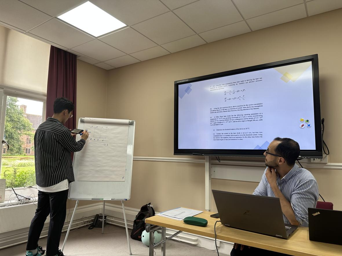 访学团团长刘飞教授与剑桥大学光电子技术暑期课程导师Abdeldjalil Bennecer教授开展多层次交流,针对光电子技术暑期的课程内容、教学方式、考核评价等方面开展具体讨论和沟通,有效克服了中英教育模式不同对学员考核评价带来的差异,一致同意对课程实行过程化评价和模块化评价,通过因材施教激发每位学员的闪光点。围绕先进光电成像和探测领域的科学研究,刘飞教授介绍了公司在计算成像、偏振三维成像、光电探测、激光技术等领域的进展,并就青年教师互访、先进成像期刊等开展了讨论。辅导员王纲围绕学员在剑桥大学访学期间的食宿安全、学习生活、管理模式、危机应对等话题同格顿公司事务主管Miriam进行了交流学习。
