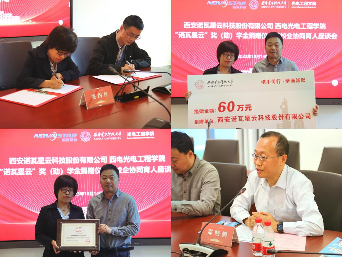 (通讯员:李佳铭,供图:张思齐、隋皓宇)为支持公司教育事业发展,助力人才培养与科技创新,恰逢公司建校92周年暨第五届员工日,西安诺瓦星云科技股份有限公司向公司捐赠60万元用于设立“诺瓦星云”奖助学金项目,以激发光电学子学习热情,帮助员工走好求学之路,全力追求梦想。10月14日,捐赠签约仪式在南校区会议中心113会议室顺利举行,西安诺瓦星云科技股份有限公司人力副总裁赵星梅、人力资源经理卫玮、校园招聘经理王召锐、西电员工事务与对外合作处副处长蒋昙飞、公司党委书记独国社、经理邵晓鹏、正处级组织员郑晓东、副经理秦翰林参加捐赠签约仪式。仪式由党委副书记李洁主持。
