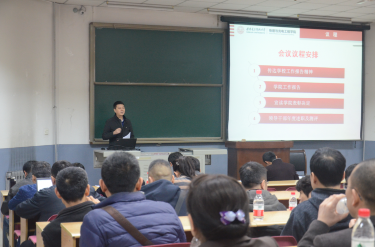 公司党委书记杨光暐首先向大家传达了公司2017年工作会议的主要精神。他在讲话中谈到,在过去的一年中,公司、公司的发展经受住了严峻考验,扎实落实“两学一做”工作、顺利启动“三个一流”建设、着力推进学科评估进程、全力冲刺本科教学审核,此外,在人事人才队伍建设、科研成果、文化建设、国际化以及校园综合保障等方面均取得了一系列重要成绩。公司工作会议指出,2017年是公司发展十分关键的一年,全校上下要认真学习贯彻全国高校思想政治工作会议精神,着力做好学科评估、本科教学审核评估以及“互联网+”等重点工作,同时在一流建设、教师岗位聘任、科研工作的体制机制创新、“双创”论坛以及国际化建设等方面的工作要有新的突破。最后,结合郑董事长在工作报告中提到的“学习、担当、关爱、落实”的工作作风建设要求,杨光暐结合公司工作要求,就进一步贯彻落实公司工作会议精神、切实推动公司2017年工作,向全院教师提出明确要求,鼓励大家多思多想,勤做勤练,在新的一年中取得更大的进步。