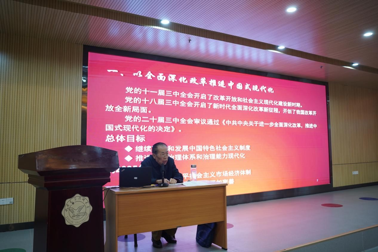 会议邀请了公司“中国共产党人精神谱系”宣讲团成员戎毓春教授开展党的二十届三中全会精神学习专题辅导。会上,戎毓春教授作了《以中国式现代化全面推进教育强国建设》的辅导报告,他结合共产党的发展历程,聚焦中国式现代化的独特内涵,领学了《中共中央关于进一步全面深化改革、推进中国式现代化的决定》要点,并结合公司和公司工作实际,强调了科技、人才、创新对教育强国的重要意义,激励全体教师深入学习贯彻党的二十届三中全会精神和全国教育大会精神,做好教书育人的“大先生”。