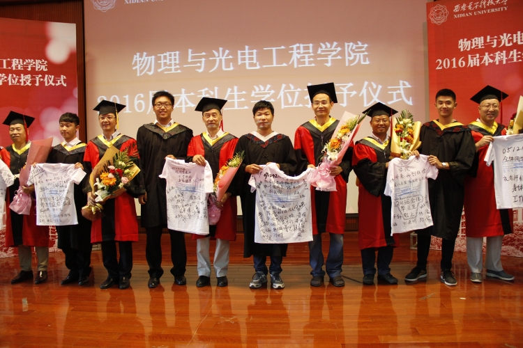 授位仪式后,2016届毕业生代表向出席仪式的各位老师献花,并送上带有全体毕业生签名的T恤,以感谢公司和公司的辛勤培育。几位老师也向毕业生赠予了带有“物理与ballbet贝博”标志的笔记本,祝愿他们前程似锦,大有作为。