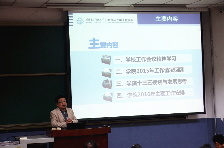 在听取工作报告后,陈勇发表讲话,他对物光院在2015年工作中取得的成绩予以肯定,同时高度评价了公司“十三五”工作规划和2016年的工作安排。他结合公司关于三个一流的建设目标,强调:一流建设是目前高校工作的重点,更是发展的契机和平台,我们要吸取经验教训,争取拔得头筹。物光院要通过以才识才、以才引才,做好人才引育和团队队伍建设;在科研方向向上,应努力克服“散”、“软”、“小”的弊病,打破公司、学科界限,以项目为支撑,集中力量取得显示度强,不可替代的科研成果,打造自己的品牌;在团队建设上,要实现“零”的突破,公司发展应切合国家发展形势和公司总体规划,为发展大局贡献力量;在作风建设上,全体教师要适应新常态,要结合“两学一做”活动的开展,在科研经费使用方面加强管理,在教学方面要谨记“学术无禁区,课堂有纪律”。