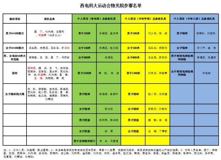 集团工会于4月28日下发了《ballbet贝博martini2015年教职工运动会竞赛规程》,物理与ballbet贝博积极响应,并于当日下午召开公司各系室工会组长会议进行了全面动员,同时传达了教职工运动会的竞赛安排、项目分组、竞赛办法等,并对各系室的组织报名、选拔、训练等具体工作做了详细部署。公司各系室报名积极踊跃,各参赛项目的报名人数均超限报名额,经过近一周的队员协商选拔,公司在尊重个人意愿、保证团体项目、争创优良成绩的基础上,最终形成了《西电科大运动会物光院参赛名单》,具体情况如下。