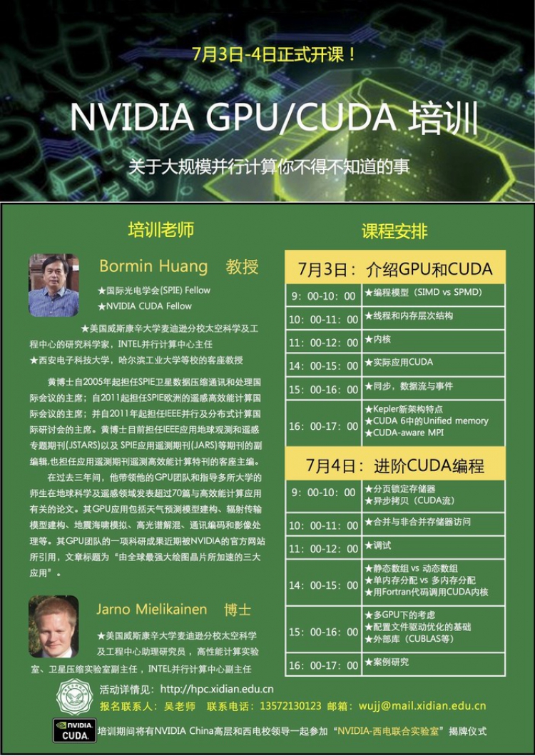 英伟达(NVIDIA)-西电联合实验室(筹备)网站今天正式上线,http://hpc.xidian.edu.cn,该实验室依托于西电物光院和ISN国家重点实验室,由威斯康星大学麦迪逊分校空间工程中心研究员Bormin Huang(CUDA Fellow、SPIE Fellow)牵头创立。目前英伟达中国仅与国家超算天津中心(天河1号)成立了联合实验室,英伟达-西电联合实验室将是国内第二家,高校第一家联合实验室。2014年7月2日,英伟达中国的总裁将赴西电参与实验室揭牌。7月3日-4日将开展为期2天的CUDA培训,由Bormin Huang教授(CUDA Fellow)及其团队成员Jarno Mielikainen博士授课 ,计划招收50-60名学员,每人学费500元人民币。报名详情方法请查询官方网站。
