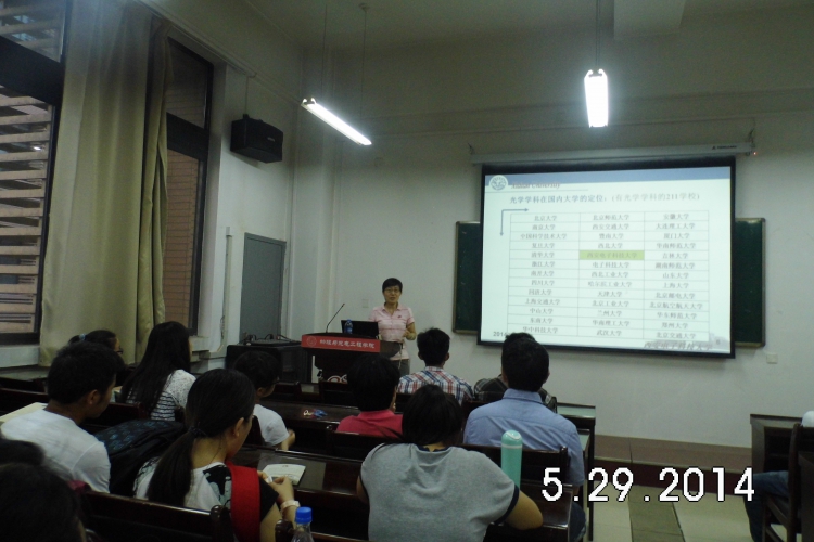 报告会上,白教授以“光学专业简介”、“光学课题组的主要研究方向”和“选择光学课题组的理由”三个方面为主,在历时一个多小时的讲座中,给同学们讲述了参加课题组的必要性及优势。整个讲座从“光学的学科概况”、“本课题组的主要研究方向”切入,讲述了“什么是光学?”、“光学的前景”及“光学类课题组的优势”等内容,并通过各种实例让同学们真切的感受到了光学的独特魅力。此外,白璐教授还就“考研与工作”、“牛导”与“非牛导”、“考外”与“保内”以及“我们该怎样选择课题组,选择什么样的课题组?”等问题给同学们作出了详细的解答,充分调动了现场气氛。讲座的最后,她鼓励同学们投身光学研究,参加到课题组中,让自身得到最大程度的进步!整个课堂上,白教授语言诙谐幽默,充分调动了同学们学习科学知识的热情。她深入浅出的讲解,恰到好处的形容举例,让在场同学们深受感染,掌声不断,现场气氛积极活跃。
