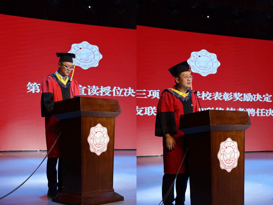 在学位授予仪式上,秦翰林、王石语、王晓蕊教授为毕业生们逐一拨穗授位并合影。同学们身着学位服,眼神坚定,与师长合影留念。与会领导、老师、员工,全体毕业生和家长们共同见证了这神圣而庄严的时刻。