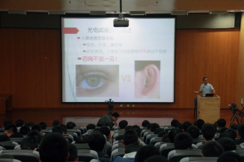邵晓鹏结合自身的研究经历对光电成像领域的发展进行了深入介绍,对光电成像技术概述、光电成像技术发展、传统光电成像技术、新体制光电成像技术、光电技术发展趋势等内容进行了一一解读。邵晓鹏通过大量丰富的图片展示,幽默风趣的语言,由浅入深的讲解,向同学们展示了光电成像的运用原理、效果以及在各领域对人类的重要影响,使深刻地了解到光电成像对现代科技的作用。针对一些抽象的科学问题,邵晓鹏运用在生活中出现的事例进行了形象生动的分析,旨在让同学们了解在科学前沿的物理学知识,营造求知探索的良好氛围。