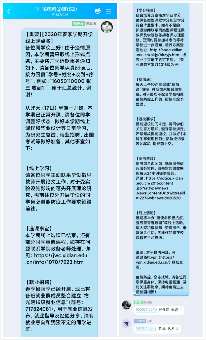 公司各年级通过不同平台,组织了线上“晚点名”,开展抗“疫”教育与开学动员教育工作。各年级辅导员通过分析了当前疫情形势、带来的挑战和对大家的要求,鼓励大家调整好个人状态,为新学期明确目标,完成好学业任务。2020新学期的“云”点名为大家开启了一个难以忘怀的新学期,大家也纷纷表示,开学“晚点名”后会以一个新的状态来应对这个难忘的学期。