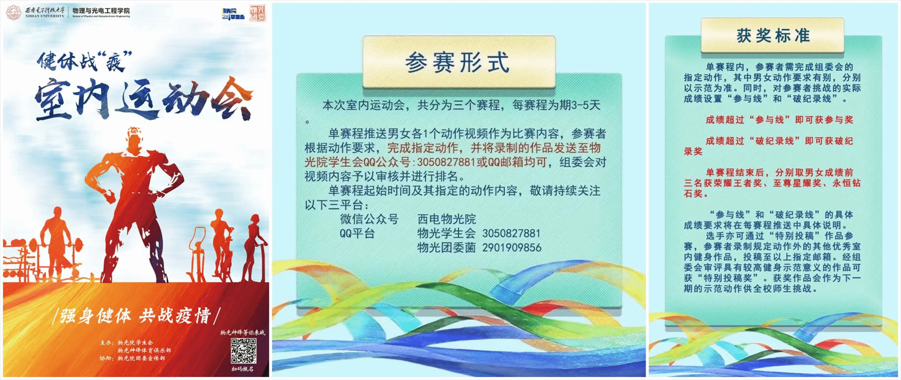 (通讯员:周兴诺 梁嘉豪 沈天昊)“疫情面前,积极防护和强身健体同等重要!”为增强公司师生新冠肺炎疫情防控意识,丰富居家抗“疫”生活方式,锻炼身体提高免疫力,物理与ballbet贝博依托线上平台举办“室内运动会”,打响线上健体战“疫”。本次活动由公司本科生辅导员刘昕玮、毕力格设计策划,公司员工会、团委、物光神锋体育俱乐部具体实施。