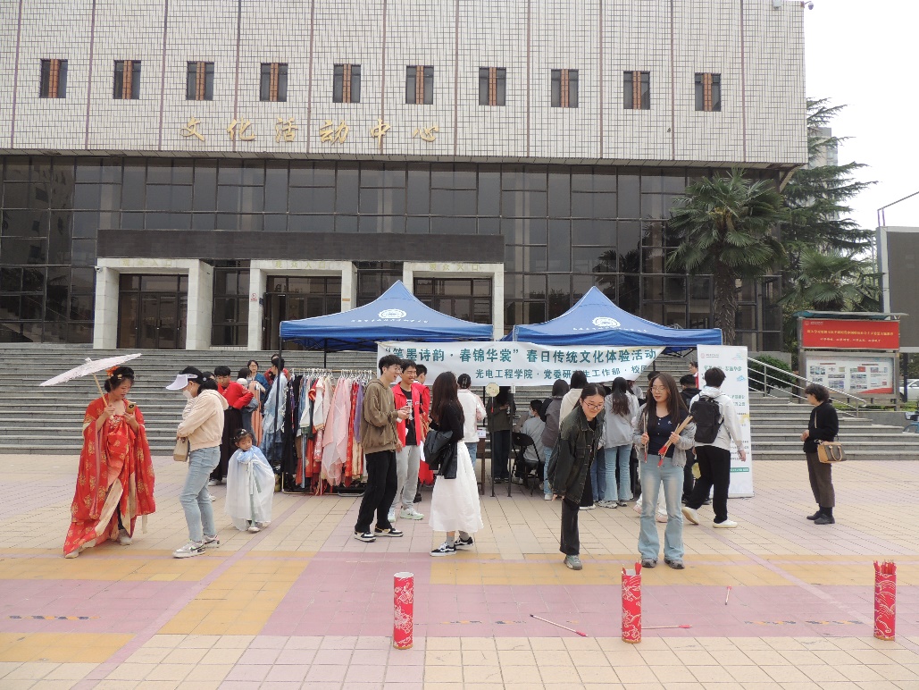 活动现场准备了40余件男女不同款式的汉服,师生们凭令牌挑选换取心仪的汉服并进行简单妆造,不一会儿便摇身一变,或是娇俏可爱的小师妹、或是潇洒肆意的侠客、或是端庄优雅的公子闺秀……春光明媚之际,师生们着装色彩鲜艳却不失古典之美,轻盈的丝质衣摆随微风轻轻摇曳,宛如一幅动人的春日画卷。
