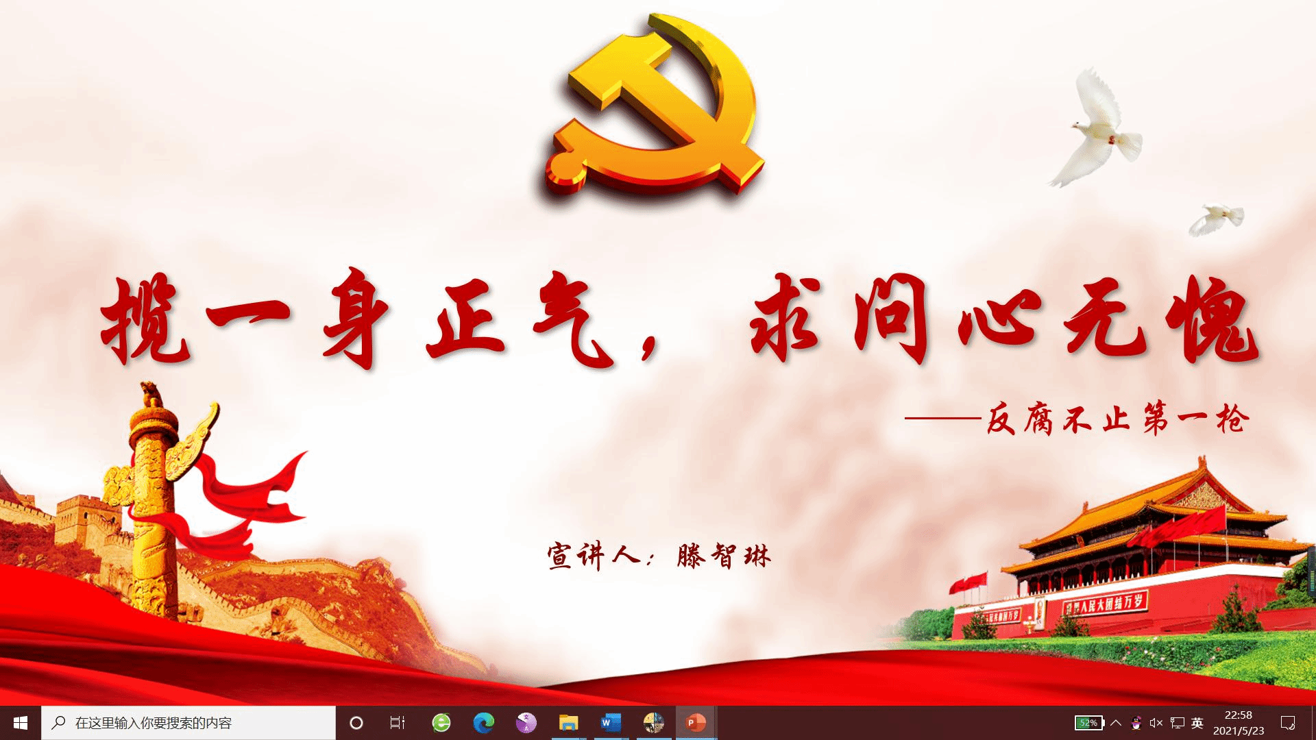 在宣讲的第二部分,滕智琳以时间为线索,概述了共产党自建立以来,对腐败问题的处理态度以及各项决策。从“打响反腐第一枪”到扫黑除恶工作的顺利开展,从“改革开放第一案”到“老虎、苍蝇一起打”的口号,变化的是时间,不变的是共产党的定力与恒心。我们发誓,要将反腐败斗争进行到底,永远捍卫党的先进性和纯洁性。