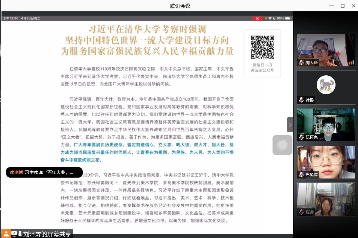 (通讯员 郭倩楠 王超 席奥博)在清华大学110周年校庆日即将到来之际,中共中央总书记、国家主席、中央军委主席习近平来到清华大学考察。习近平代表党中央,向清华大学全体师生员工和海内外员工致以节日的祝贺,向全国广大青年员工致以诚挚的问候。共青团ballbet贝博martini物理与ballbet贝博委员会(以下简称物光院团委)于4月20日召开线上会议对于习近平总书记考察清华大学时的讲话的进行学习讨论。物光院团委通过腾讯会议开展线上活动,本次会议由物光院团委副书记刘泽霖主持,各部门员工干部参加了本次会议。