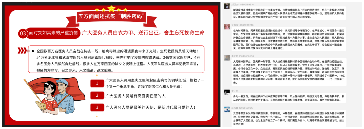 员工党员史剑超谈道,经过今天的专题学习和与党支部其它同志的交流,我深感中国特色社会主义的优越性和身为一名共产党员的骄傲。在来势汹汹的疫情面前,我国能抵住危情迅速反应,无数在疫情中涌现的人民英雄体现了中华儿女无私奉献的精神。我今后更要提升自己,报效国家,造福人民。