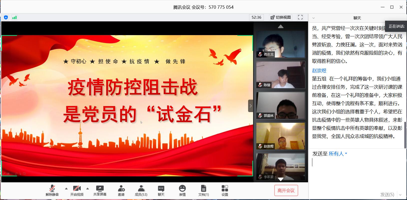本次党课通过线上研讨的形式,学习了疫情期间优秀党员先进事迹,大家深刻认识到共产党员在困难来临时应如何发挥先锋模范带头作用,看到了在抗击疫情过程中共产党员践行初心使命的具体表现,唤醒了同学们强烈的使命感和责任感,更加坚定了努力成为一位优秀共产党员的决心。