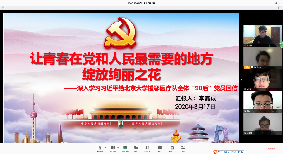 (通讯员 白林桦)3月15日,习总书记给北京大学援鄂医疗队全体“90后”党员回信,对广大青年在疫情防控第一线做出的努力给予了充分的肯定。物理与ballbet贝博员工党支部于近日举行关于习总书记回信的线上学习讨论会,会上同学们积极参与讨论,大家纷纷表示作为青年一代,应当挺身而出、担当奉献,充分展现新时代中国青年的精神风貌。
