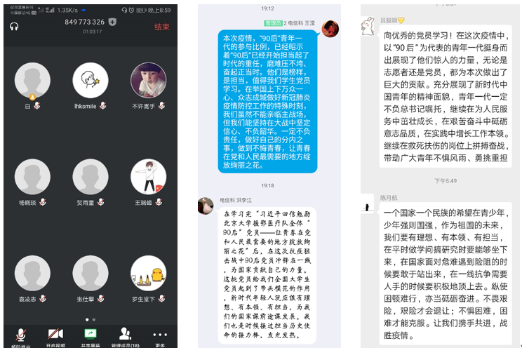 本科16级第三党支部陈佳霖说到“作为当代90后老员工,面对这次疫情,我们展现了中国的青春力量,积极为防疫做出贡献。伟大出自平凡,平凡造就伟大,每一个人在社会中都可以奉献自我,在奉献的过程中实现自己的人生价值。同时作为新时代的青年要树立坚定地理想信念,理想信念找事了人生的奋斗目标,以理想信念督促自己奋力前进,在服务人民、奉献社会的事件中创造有意义的人生,不断攀登属于自己的人生巅峰!”